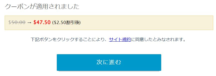 クーポンコード入力欄は最後のほうにあります。コピー&ペーストしたクーポンコードを入力して「適用」をクリックします。手動で入力してもいけますが、入力間違いをすると適用されないので気をつけてください。