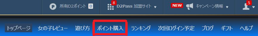 DXLIVEの画面右上にある「ポイント購入」をクリックします。スマホの場合は左上のメニューをタップすると「ポイント購入」という項目があるのでタップします。