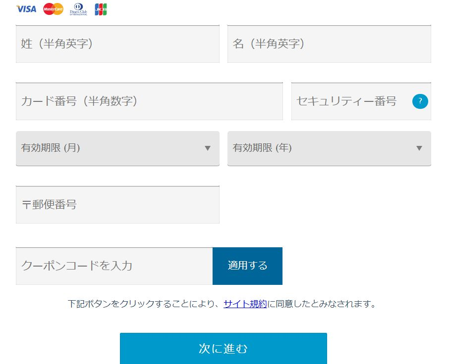 決済ページが開くので、必要事項を入力していきます。デビットカード情報はすでに会員登録時に入力しているので、再度入力する必要はありません。もし違うカードを使う場合は、別のカード番号を入力して使用することもできます。