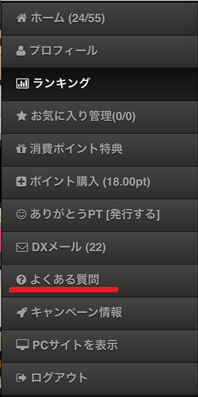 DXLIVEのスマホからアクセス後、左上のメニューをタップします。「よくある質問」をタップしてください。
