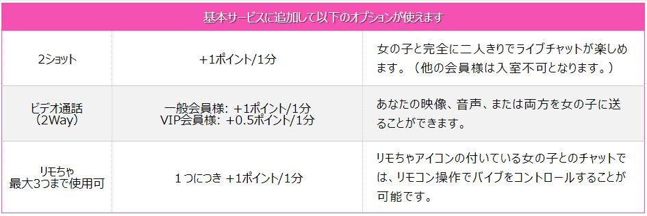 例えばDXLIVEのスマホ版で、以下のようなチャットとオプションの組み合わせができます。チャットは1分/1.2PT、オプションは1分/1PTなので、合計すると1分/2.2PTで利用可能です。