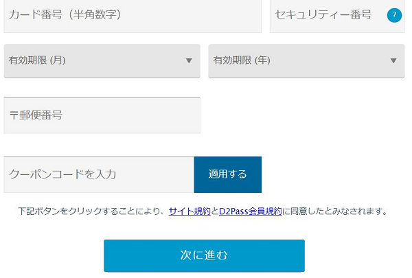 DXLIVEで使えるカードブランドは「VISA」「JCB」「Master Card」「Duiners Club」の4種類です。クレジットカードもしくはデビットカードが使えます。クレジットカード番号、セキュリティー番号、有効期限を入力します。