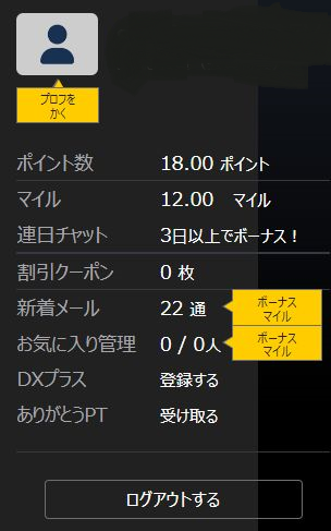 DXLIVEにログインした時に表示される画面が以下の通りです。現在所持しているポイントやマイルも表示されています。